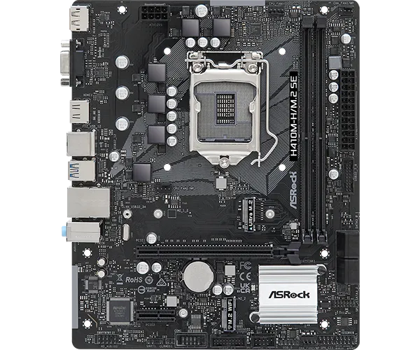 Материнская плата ASRock H410M-H/M.2 SE может стать основой компактного универсального домашнего или офисного системного блока. Плата совместима с процессорами LGA 1200. Дизайн платы можно без тени сомнений назвать классическим. Чипсет платы – хорошо известный в корпоративной среде